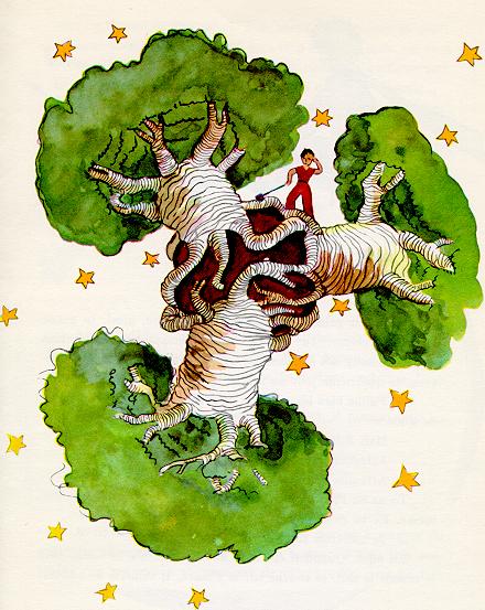 于是,根据小王子的说明,我把这个星球画了下来。我从来不大愿意以道学家的口吻来说话,可是猴面包树的危险,大家都不大了解,对迷失在小行星上的人来说,危险性非常之大,因此这一回,我贸然打破了我的这种不喜欢教训人的惯例。我说:“孩子们,要当心那些猴面包树呀!”为了叫我的朋友们警惕这种危险——他们同我一样长期以来和这种危险接触,却没有意识到它的危险性——我花了很大的功夫画了这副画。我提出的这个教训意义是很重大的,花点功夫是很值得的。你们也许要问,为什么这本书中别的画都没有这副画那么壮观呢?回答很简单:别的画我也曾经试图画得好些,却没成功。而当我画猴面包树时,有一种急切的心情在激励着我。