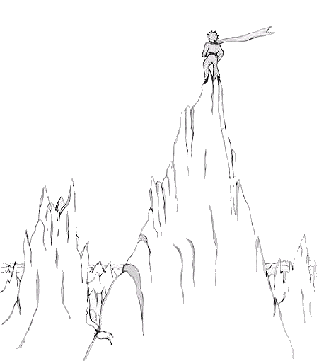 “你好。”小王子说。 “你好。”花说。 “人在什么地方?”小王子有礼貌地问道。 有一天,花曾看见一支骆驼商队走过: “人吗?我想大约有六七个人,几年前,我瞅见过他们。可是,从来不知道到什么地方去找他们。风吹着他们到处跑。他们没有根,这对他们来说是很不方便的。” “再见了。”小王子说。 “再见。”花说。 第 19 章 小王子爬上一座高山。过去他所见过的山就是那三座只有他膝盖那么高的火山,并且他把那座熄灭了的火山就当作凳子。小王子自言自语地说道:“从这么高的山上,我一眼可以看到整个星球,以及所有的人。”可是,他所看到的只是一些非常锋利的悬崖峭壁。